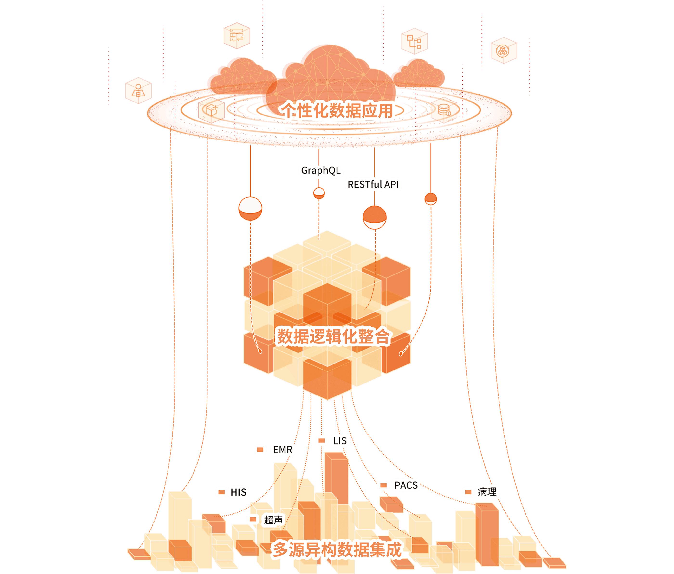 醫眾醫療數據服務采用 Data Fabric 數據編織的架構理念,幫助用戶應對在數據資產化進程中產生的復雜性、分布式、多元化等因素,從單純的以數據應用為核心建設數字化,向體系化的數據服務能力建設轉型。
